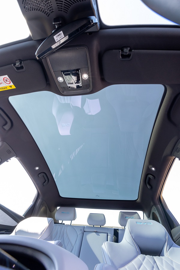O BYD Seal possui teto solar panorâmico de grandes dimensões, proporcionando aos ocupantes uma visão ampla. As portas dianteiras são de vidro duplo laminado para maior segurança e excelente isolamento acústico e térmico.
